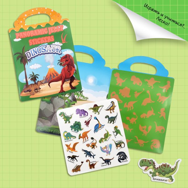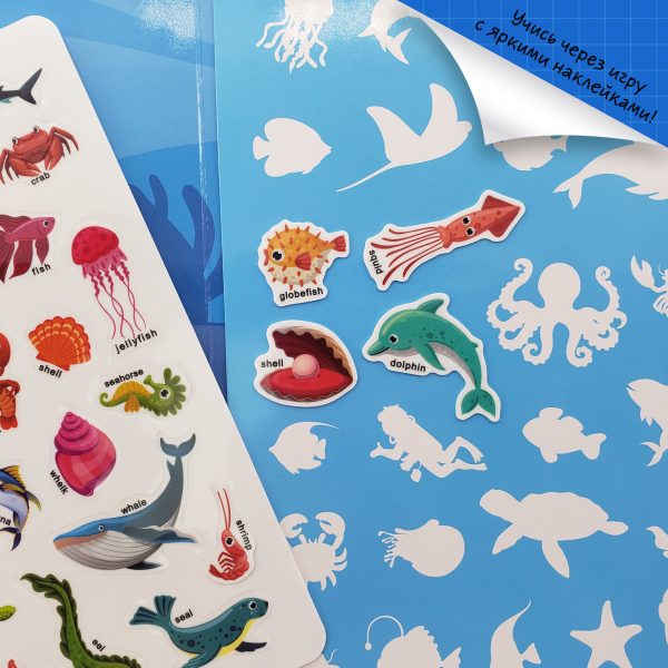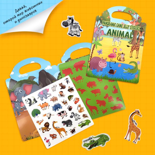 Каждый комплект включает красочное поле с контурами, куда можно клеить многоразовые наклейки с изображением морских обитателей, диких животных, насекомых и доисторических гигантов — надписи на наклейках помогают детям изучить всех.